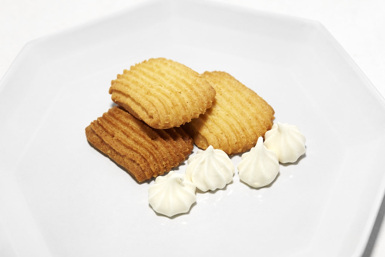 コゲカンのクッキーは、焼成が逆になり、3段絞りがコゲ味、2段絞りが生チーズ味となります。